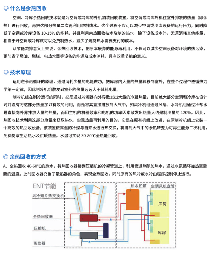 余热回收机组可以利用蓄冷空调机组工作时候排放蒸发冷里面的热量做不同温度的梯级回收,可以回收80-90℃的高温水做消毒清洗用,40-50℃的中温水做洗澡和食堂用,20-30℃低温水做污水加热使用。为企业能源多级利用添砖加瓦做贡献。